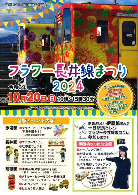 今年もフラワー長井線まつりが開催されます。開催日 令和6年10月20日(日曜日) 10:00~15:30※荒天の場合、中止にする可能性があります。開催情報は山形鉄道HP・SNSをご確認ください。 各駅イベント内容赤湯駅・フラワーアートを背景に写真を撮ろう!(山形鉄道赤湯駅舍内)長井駅・フラワーマルシェ・吹奏楽フェスタ 《長井小学校→10:30~11:00、長井北中学校→11:00~11:30、長井高校→11:30~12:00、長井南中学校→13:00~13:30》 その他バンドステージも開催。荒砥駅・車両基地見学(各回30名定員) 1回目 10:45~ 2回目 13:15~・ATカート&レールスター乗車体験 [午前:ATカート 、午後:レールスター]・ハロウィンパーティー・はたらく車大集合 JR米坂線タイアップ運転区間は、今泉(13:57発)〜長井(14:05着)、長井(14:15発)〜今泉(14:23着)乗車には、事前申込が必要です。料金→1,000円、定員→51名(先着) 西大塚駅(開業110周年) ●歌声喫茶●オカリナ演奏●玉こんにゃく●鶏のからあげ●コーヒー●アルコール類●キッチンカー etc.羽前成田駅 ●芋煮会 ●オカリナ演奏 ●ちびっこ集まれ!おもちゃをゲット ●小野孝志写真展