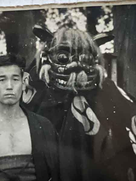 1950年代の雷神社の写真より 角力は平井孫七氏と小形善四郎作の獅子頭