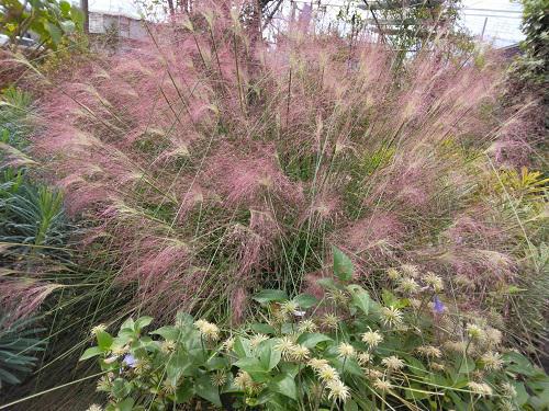 今日も朝から雨!庭仕事も、なんにもやる気が出ません・・・いろいろやらなくちゃいけないことがたくさんあるのにスイッチ入らずデス。 おととい、天気がよかったので外でお茶タイム〜二人で庭を眺めながら、グラスの”ミューレンベルギア・カピラリス”はやっぱり一番いいね!なんて話しながら撮ってみました。去年から、何回もUPしているグラスです。紫の霧のように見える繊細な散開穂が魅力的!(去年も同じ事書いていますが…) ↓その下では、可愛いらしい風景が…(自画自賛!) 後ろの方からも可愛いです! ↓何年もこの場所で…この場所が一番合うようで、今の時期にきれいな姿を見せてくれます。手のかからない寄せ植えですが、毎年、土の入れ替えだけはやっています。 おまけに。。。 久しぶりに”サハラ98”登場〜 秋らしく・・・ヒマワリから交代です〜 ↓“バーノニア”のシードヘッドも入れてみました〜♪