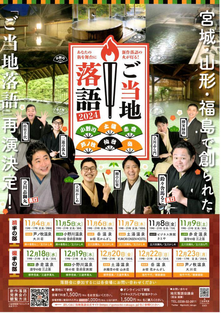 古くから受け継がれてきた噺は「古典落語」と呼ばれ、最近の落語家さんの創作によるものを「新作落語」と呼びます。落語家があなたの街を舞台に地元住民と交流し、聞いた話を根多(ネタ)にして創作した新作落語が「ご当地落語」です。この機会にぜひ「ご当地落語」をお楽しみください!◇11月5日(火)19時〜21時/定員:30名開催地:山形県 小野川温泉 鈴の宿 登府屋旅館出演者:鈴々舎馬るこ・立川かしめ◇12月19日(木)19時〜21時/定員:30名開催地:山形県 小野川温泉 鈴の宿 登府屋旅館出演者:柳亭信楽・三遊亭萬丸※その他の開催地はこちらをご覧ください。◇料金:1,500円(税込)・現地で観覧の場合、会場でお支払いください。・オンラインで観覧の場合、ツイキャスプレミア配信チケットをご購入ください。◇お問い合わせ地元落語協議会(担当 遠藤)TEL:0238-32-2611(営業時間11:00〜17:00)〒992-0076 米沢市小野川町2493番地