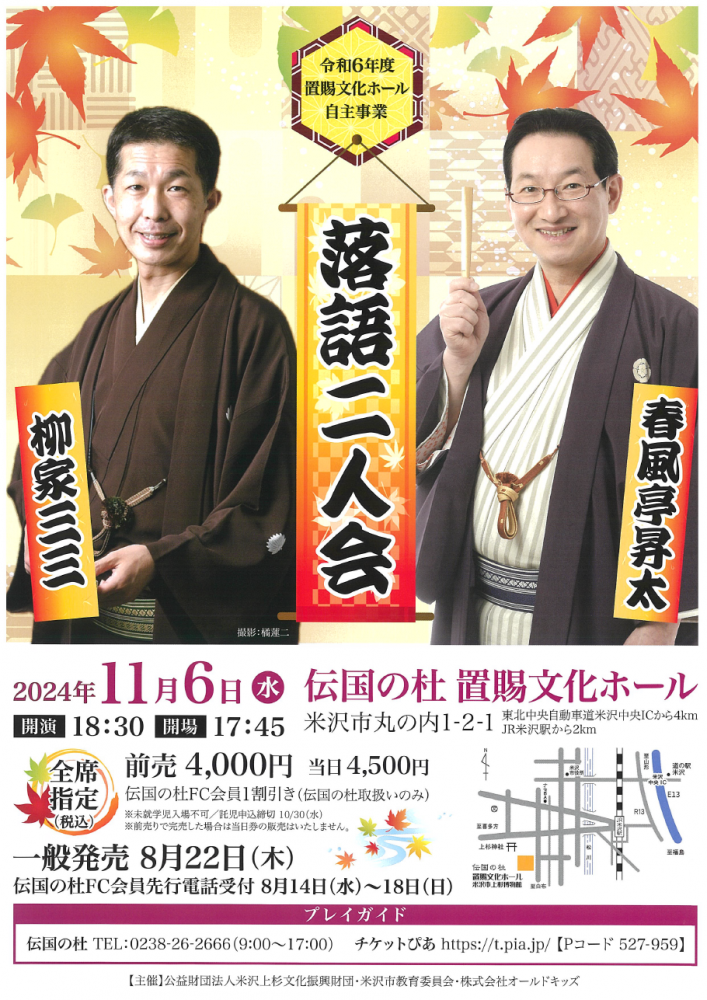 令和6年度置賜文化ホール自主事業として、伝国の杜置賜文化ホールにて、落語二人会が開催されます。柳家三三氏と春風亭昇太氏による公演です。この機会にぜひ、ご来場ください。<開催日時>令和6年11月6日(水)開演18:30(開場17:45)<場所>伝国の杜置賜文化ホール<料金>全席指定(税込)前売:4,000円当日:4,500円<お問い合わせ>伝国の杜置賜文化ホール 0238-26-2666詳細はチラシをご覧ください。