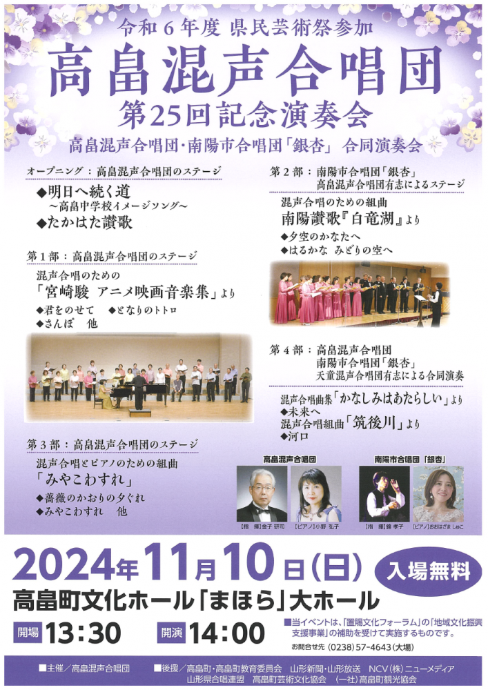 置賜総合支庁、置賜3市5町の文化行政担当部局、各市町の芸術文化協会などで組織する置賜文化フォーラムでは、置賜地域の文化振興と地域活性化を図ることを目的に、置賜地域の住民が主体となった文化事業に対し、補助金を交付しています。今年度採択された「高畠混声合唱団」では、第25回記念演奏会を開催します。演奏会では、高畠混声合唱団のステージの他、南陽市合唱団「銀杏」との合同演奏も行われます。ぜひ、ご来場ください。<開催日時>令和6年11月10日(日)13:30開場 14:00開演<場所>高畠町文化ホール「まほら」<入場料>無料<お問い合わせ先>高畠混声合唱団(0238-57-4643)詳細はチラシをご覧ください。
