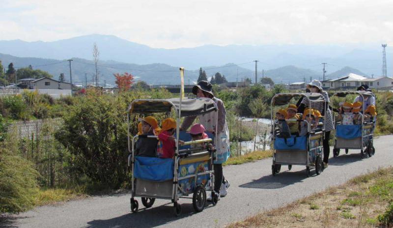 ●秋の陽ざしの中乳児園のお散歩カーが気持ちよさそうに散歩中です 今年度の南陽8ミリクラブの作品「ふるさとの母なる川 吉野川」の最後を飾るシーンとして選んだのがこの散歩カーです 幸せをもたらしてくれる子ども達の笑顔や歓声は何よりの宝物です そんな子ども達が吉野川べりを散歩している様子はまさにフィナーレにふさわしいのではと撮影時に撮った1枚がこの写真です 8ミリクラブの作品ではどのように最後を飾ってくれるのでしょうか