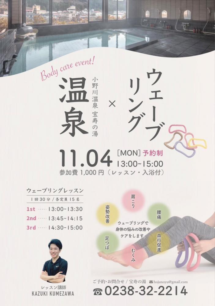 ウェーブリング×温泉体験を11月4日(月)にします。参加費 1,000円(レッスン・入浴付き)ウェーブリングレッスン 第1部 13時〜13時30分第2部 13時45分〜14時15分第3部 14時30分〜15時各パート30分、各定員15名ウェーブリング運動により、肩こり、腰痛、血行促進などに効果があり、温泉入浴と組み合わせることにより相乗効果が期待できます。ぜひ、この機会にご参加ください。ご予約 0238−32−2214 または hojunoyu@gmail.com