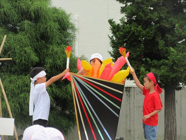 前日の雨で心配された園庭も、当日はすっかり土が乾き快晴の天気に恵まれました。早朝から役員さんのお手伝いもいただき、大成功に終わった運動会でした。この日のために毎日練習に励んだ子どもたち、運動会を通じて心も体も一回りたくましく大きくなった様子です。 今年も東部保育園らしい、笑顔、涙、真剣で熱い戦いが繰り広げられ、たくさんのドラマが生まれました。 ゆり組さんは保育園最後の運動会、お家の人からメダルを掛けてもらい、誇らしげな表情でした。
