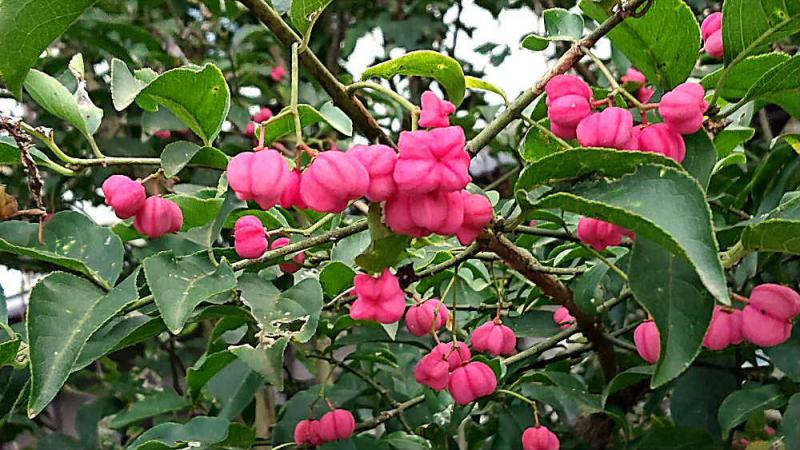 ●これは実? それとも花?・・・ 初めて見る花木で写真はピンクですが赤い色をしています ネットで調べてみると「セイヨウマユミ」とヒットしました 花がはじけて中から黄色の実がでてくる写真もありました この花木は毒性があるのだそうです たまたま散歩中に目にした花木ですがあまり目にしないのはこのせいでしょうか