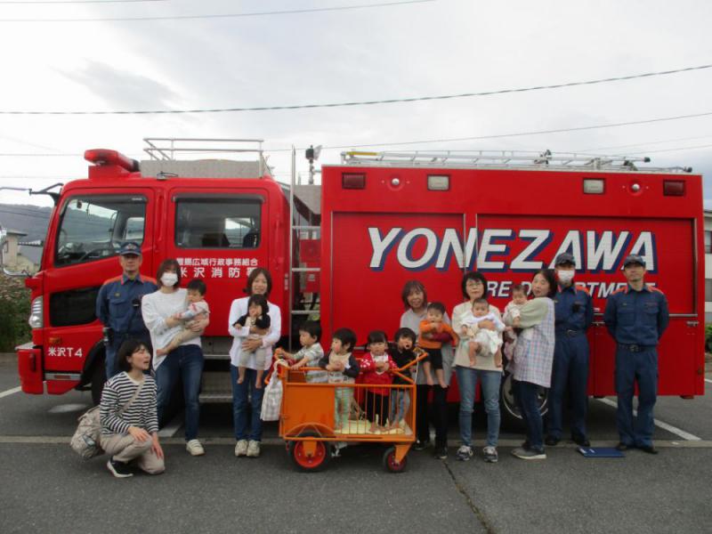 10月23日(水)防災訓練がありました。火災の設定で第一避難場所(保護者駐車場)に避難し、米沢市消防署の消防士の方に避難する様子など見ていただきました。みんなで大事な「おはしも」の約束を確認しました。職員が水消火器を使い消火訓練をしたり、子どもたちと職員と一緒に近くで消防車を見たりしました。最後はかっこいい消防車の前で、クラス毎写真撮影。ゆり組(年長組)はキッズ防災着を着て消防隊員になりきりポーズをきめていました。