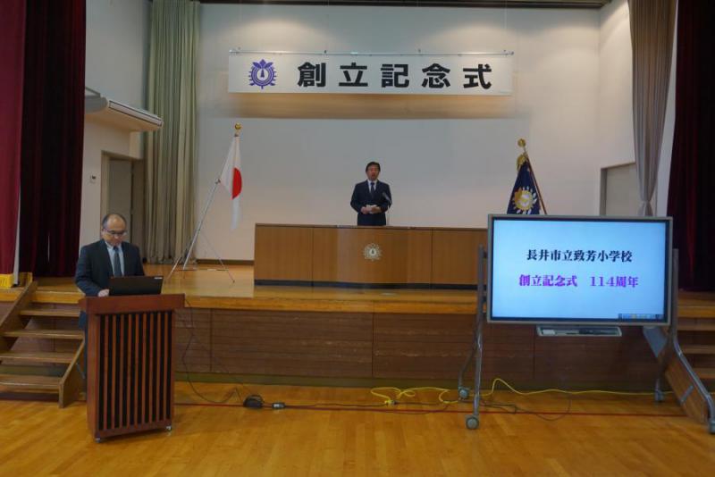 11月1日は、本校の創立記念日。創立114周年になります。区切りの年には、お客様をお呼びして盛大に開催しますが、その他の時は全校朝会を延長して行っています。オープニングは「平和の鐘」です。式辞の中では、校章のことについて話をしました。「栴檀は双葉より芳し」ということわざが由来になっていると。校章の真ん中にあるのが栴檀の双葉で、まわりを大きく成長した成木が囲んでいます。そして、双葉の上に付いているのは「自分を写す鏡」。子どもの頃から努力して頑張っているとしても、今の自分を振り返ることが大事であるとの教えです。なるほど…であります。昇降口前には「せんだんの庭」という名称とことわざが刻まれた石碑があります。このまわりの樹木は、旧致芳中学校から移されたものと記録が残っています。児童代表の言葉も立派でした。致芳小学校のよい伝統をしっかりと引き継いでいます。最後に、校歌を3番まで元気よく歌いました。「平和の鐘の〜」と続くフレーズとメロディは数ある校歌の中でも名曲に値すると評した方もいるとか。卒業生の皆さんの心には、きっと響き続けることでしょう。厳かで良い式となりました。
