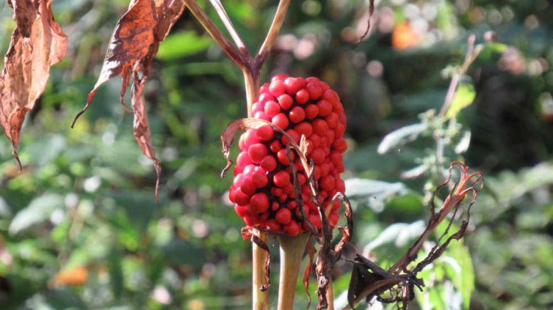 ●野草園で見つけた毒々しい赤い実はなんという植物でしょうか 調べてみると「マムシグサ」の実かなと思われます 有毒であると言われており 以前このブログで「マムシグサ」の葉を紹介したことがありました 葉も決してきれいなものではなく生えていた場所もあまり気持ちのよい場所ではない処刑場跡だったのでなおさら気持ち悪い草だったような気がします