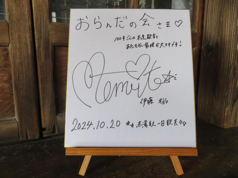 駅前での芋煮会が終了し、待合室で2次会が始まった頃、一日駅長の仕事が終わった伊藤桃さんが成田駅に立ち寄ってくれました。伊藤さんのインスタグラムからその一部を紹介します。 ///// 私がこうしてフラワー長井線に足しげく通うきっかけとなった大好きな羽前成田駅。100年を越える開業時からの木造駅舎。もちろんそれだけで最高なのですが、この駅の好きなところは地元の方々、おらだの会の皆様が駅舎を「人が集まる場所」として大切にしているところ。 遅れて来た私のために残していてくれた鍋に、改めて火を入れてくれたので、あつあつの芋煮をいただけました。すっごく美味しかったです。「どんどんけ」これは私の故郷の野辺地の方言ですが、こんなニュアンスの山形弁で勧めてくれて、おじいちゃんを思い出してほっこり。 帰り際に渡してくれたお弁当を、新幹線の中でいただきました。お昼に参加できなかった私のために、おかずを取り分けてお弁当にしてくれたのです。嬉しかったなぁ。もちろんお味も美味しくて、最後まで本当に幸せな気持ちにさせていただきました。本当にありがとうございました。(伊藤桃)///// 【おらだの会】奥さん方が気配りしてくれたんですね、良かったです。(家では怖い○○なのですが(笑)) 写真は、伊藤桃さんが残してくれた色紙です。