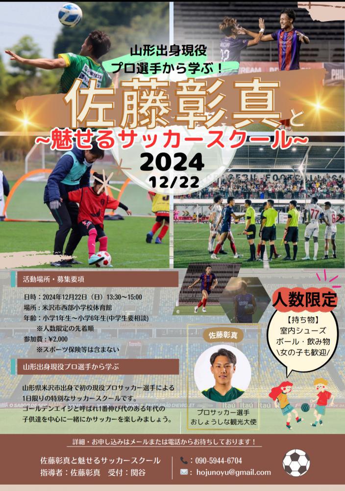 米沢市出身のサッカー選手でおしょうしな観光大使でもある佐藤彰真選手がサッカースクールを行います。日時 12月22日(日)13時30分〜15時場所 米沢市西部小学校体育館対象年齢 小学生(中学生要相談)参加費 2,000円 ぜひ、世界のいろんな国でサッカーをしてきた経験、技術を学びにいらしてください〜 お申込み 090−5944−6704(関谷)メール hojunoyu@gmail.com