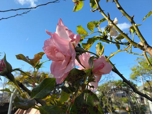 今朝はもやがかかっていて、早い時間に日が差して来て青空が〜!今日のUP出来る写真が撮れることを期待して寒い中、庭へ・・・ ↓7時半まえでちょっと暗い感じですが、ネタ花らしきものが撮れました! 何回も登場の”ローゼンドルフシュバリーズホップ”古いバラですが、誘引していた4脚アーチも歳には勝てずスクラップに・・・。 (トップ写真)は・・・9時半すぎの同じバラですが、空も明るく日が差してきたので再度!きれいに撮れました。 ↓支えが無くなったこのバラを支えている柵は、隣にあった別の4脚アーチの1脚を外して利用しています。 ↓ここの場所です〜ここは、3脚だけで今何とか保っています! いつもの上を向いて、青空をパチリ!当分この青空は見れないようです・・・