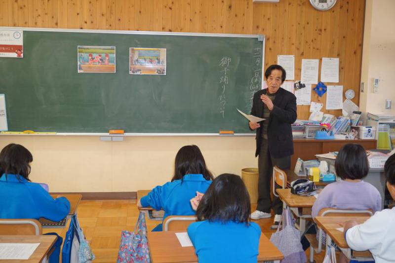 本校の伝統である「少年少女五十川獅子踊り」は、現在、5・6年生が取り組んでいます。今年も学習発表会と地区文化祭で、その踊りを披露しました。いずれも大好評で、たくさんの方々からお褒めの言葉をいただいたところです。3学期になると、新たに踊り手となる4年生への引継ぎが行われます。6年生の大切な役割でもあります。その前に…、ということで、「少年少女五十川獅子踊り」のことを詳しく知るための事前学習が本日行われました。講師として、長年、お師匠様としてご指導をいただいる代表の方をお招きしました。まず、お師匠様から子どもたちに、「みなさん、獅子踊りをやってみたいですか?」と投げかけがありました。すると、間髪入れずに「やってみたい!」という声が広がりました。これが伝統なんでしょうね。学校で取り組んでいる踊りは「五十川獅子踊り」を参考にして「ふるさと学習」のためにつくられたこと、「五十川獅子踊り」の由来や歴史、さらには、その踊りに込められた意味や願いなどについて、詳しくお話をしていただきました。今日の学びが、3学期の引継ぎ活動へつながっていくことでしょう。