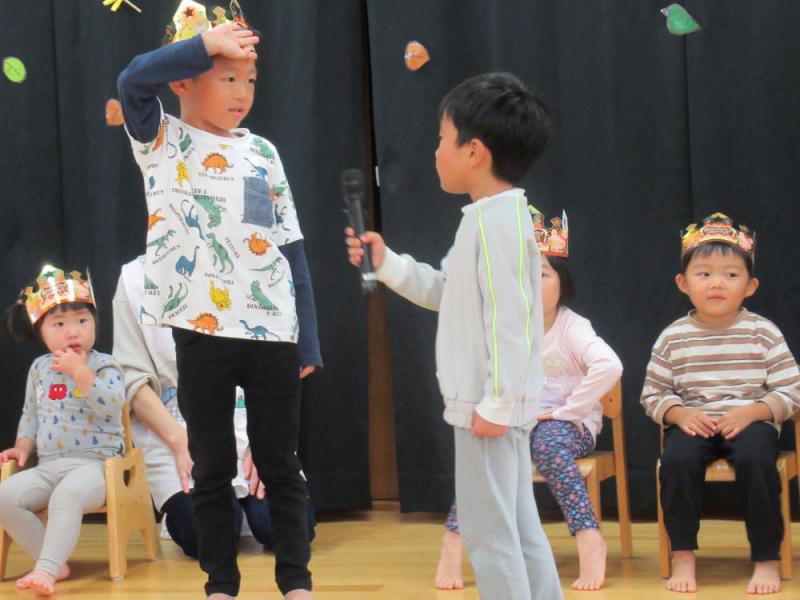 今日は10月生まれのお友だちの誕生会でした。お休みの子もいて残念でしたが12名のお友だちをみんなでお祝いしました。 得意なことでは鉄棒が大人気!4歳児の子を中心にすご技を披露してくれたり、絵画、ブロック、リズム運動、着替え、サッカー、太鼓など堂々と発表してくれました。 職員の出し物”お楽しみ”は、4歳児の誕生児と一緒に先日行われた運動会やこれからのお楽しみであるさつまいも堀などの話を盛り込んだ劇「さつまのおいも」。子どもたちがお芋を食べておならをしてしまうところで大盛り上がりとなりました。