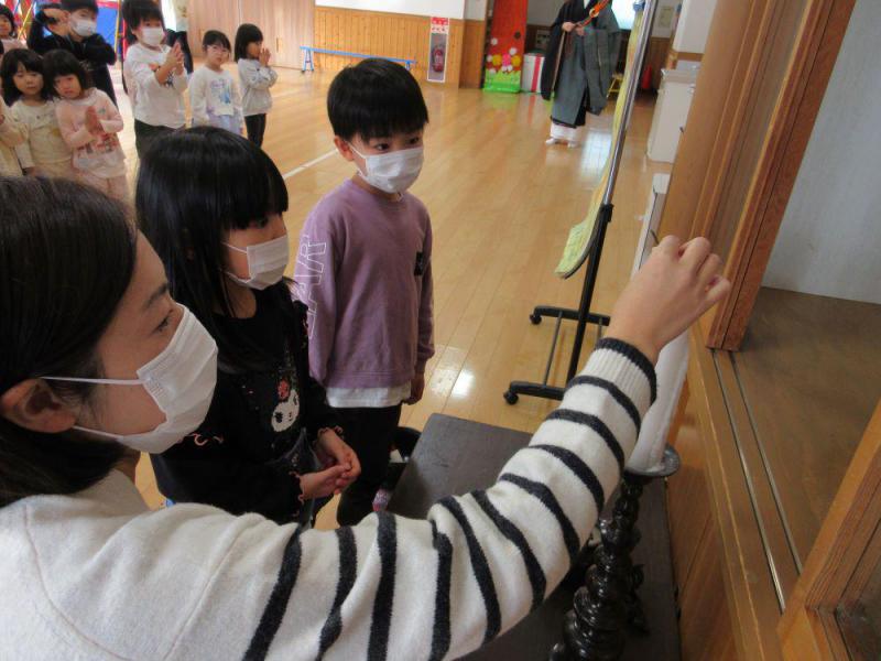 12月8日はお釈迦様がお悟りをひらいた日です。今年は日曜日にあたっていたため12月5日にみんなでお祝いしました。「成道会はどんな日?」という保育者の質問に「お釈迦様がお悟りをひらいた日」と答える年長さん。「お悟りって何?」とさらに質問すると「みんながどうやったら良い子になるか考えてわかった日」と年中さんが答えます。毎年しっかり話を聞いて覚えていたことに拍手でした。