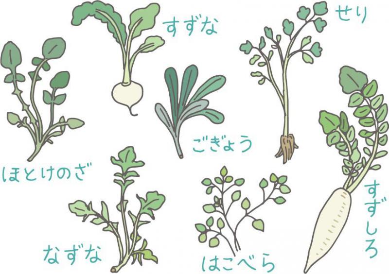 【人日の節句】ネットから新しい年を迎えて7日目。1月7日は、「人日の節句」または、「七草の節句」といい、春の七草が入った七草粥を食べる風習があります。この風習の起源は古代中国。その昔、中国では正月元旦(1月1日)を鶏とし、6日までをさまざまな動物に見立てた占いを行う日としていました。人を占う日にあたる7日は処刑を行わない、としていたため「人日」と呼びました。また、この日には、7種類の野菜を入れた汁物を食べたとされます。奈良時代に日本に伝わったのがはじまりで、その後、お正月に若菜を摘んで食べる“若菜摘み”や7種の穀物をお粥にして食べる風習などと結びついたと言われています。セリ、ナズナ、ゴギョウ(ハハコグサ)、ハコベラ、ホトケノザ(タビラコ)、スズナ(カブ)、スズシロ(ダイコン)。春の七草をすべて合わせると約12種類の薬膳効果があり、ビタミンやミネラルも含まれているとか。
