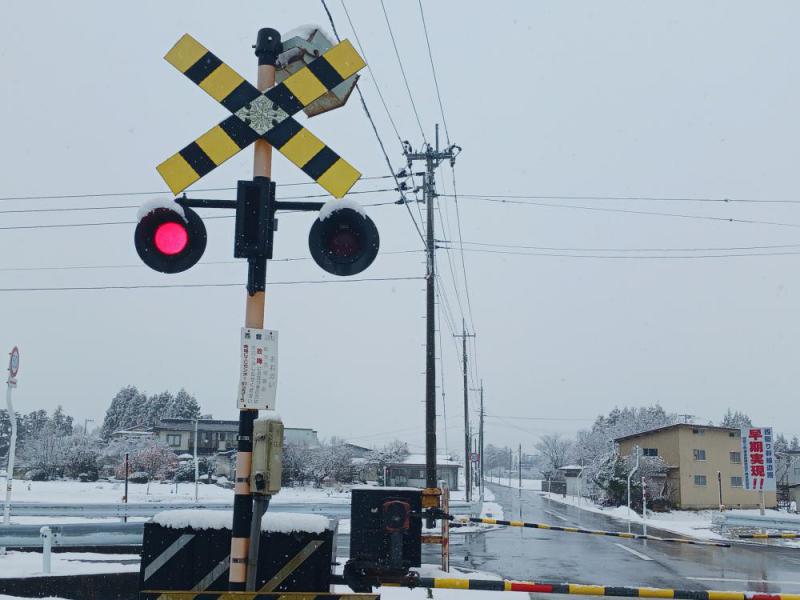 蒸気機関車の看板をみて、踏切に近づくと目に入るのが警報器です。西舘踏切には警報器の標準設備を見ることができます。 警報器は黄色と黒で色付けされています。この配色は、強烈な毒針を持った蜂の配色です。この配色は、私達に「危険!」であることを認識させるものになっています。しかも赤い電灯が左右に並び、「カンカンカン」という音に合わせて左右交代で点灯します。さらに濃い赤色灯を黒い縁取りで、さらに視覚に訴えるようになっています。 このように、横並びに設置された2基の赤色灯が、踏切警報器の基本型である、と考えられます。とすれば、西舘踏切の西側は、三つの道路が交差しているため、3基6灯があるはずです。調べてみると確かに、そのようになっていました。さて、それでは第2踏切や第4踏切は、どうなっているのでしょうか。それは次回のお楽しみに!