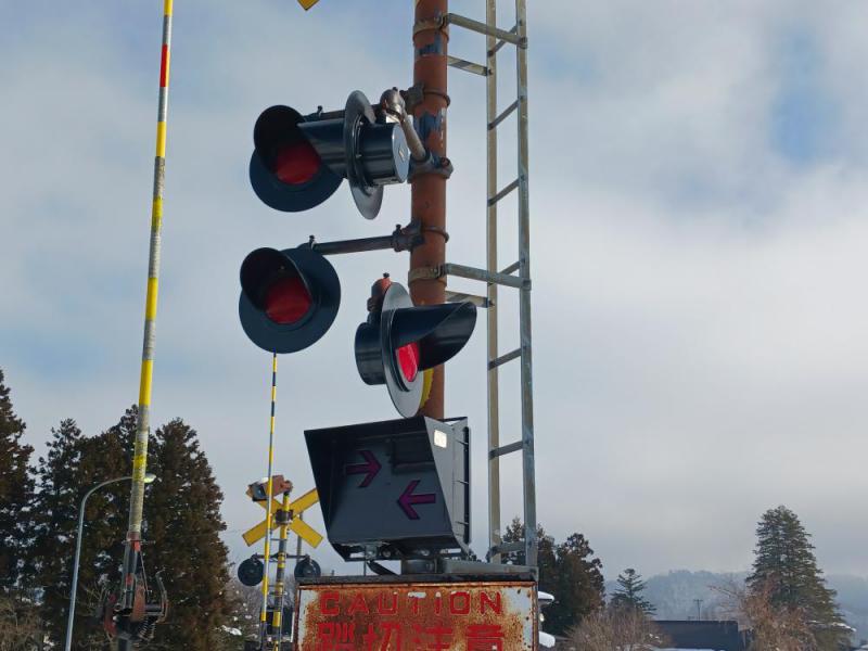 一番南にある成田第2踏切を見てみます。東側の警報器は西舘踏切と同じく、2基の赤色灯が横に並んでいます。そして西側に廻ってみると写真のような構造になっています。 西舘踏切は6基の赤色灯を設置していましたが、ここでは同じ三叉路でありながら4基の赤色灯で対応しています。正面は2基の赤色灯が横ではなくて縦に並んでいて、「カンカンカン」に合わせて交互に点滅します。南北の道路に対しては、上の電灯が北を、下の電灯が南に向いて付けられています。そのため、2個が交互に点滅する方式にはなっていません。 西舘踏切でみられた赤色灯の2基横並びによる交互点滅方式は、第2踏切では採用されていません。そのため、目に飛び込んでくるインパクトは、西舘踏切よりも弱いように思われます。それでもここには列車の走行方向を知らせる装置が付けられています。これは西舘踏切と第4踏切にはないものです。それぞれ何年頃に設置されたものか、とても気になるところです。