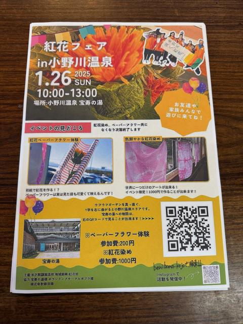 紅花フェアin小野川温泉が開催されます。日時 1月26日(日) 10時〜13時場所 宝寿の湯参加費 ペーパーフラワー体験 200円 紅花染め 1,000円ぜひ、遊びにいらしてください〜