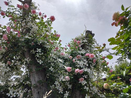 2023年には、素敵な風景に。。。 2021年、栗の枯れ木に絡ませていたつる性植物を剪定し、高齢バラ”スパニッシュビューティ"のシュートを誘引。 =============================== 2023/5/23ブログより。。。 オープンガーデンの頃には終わってしまう”スパニッシュビューティ"先日から何回も登場している“モンタナ”の中に埋もれて咲いています!さながら雪に埋もれたバラです。この様な風景は初めてです。。。”スパニッシュビューティ"は、バラを始めた頃の高齢バラですがシュートが出てくれたので”枯れ木(栗)”の方へ誘引してみたらこんなにも素敵な風景になるなんて。。。正解でした(^^) しかし・・・ ↓肝心の今までのアーチの所は、毎年花数が少なくなってきました。養分がとられているのかも・・・でも、一番の頑張り屋さんですね。このバラが咲き始めると、一番心ときめきます。 2023/05/16ブログより。。。 ”スパニッシュビューティ"はまだ開花していなくてモンタナだけが枯れ木を覆い隠すように咲いています。 ======================== 2022年5月は。。。 2021年に剪定したばかりでこんな感じです…