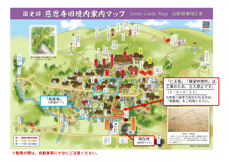 側溝整備工事に伴い、慈恩寺テラスから本堂へ徒歩で向かう入口の「仁王坂」は次の期間通行止めです。展望休憩所も閉鎖となりますのでご注意ください。 ●令和7年2月3日(月)〜令和7年3月21日(金)※予定 慈恩寺本堂への行き方についてのご質問は慈恩寺テラス スタッフへお気軽にお問い合わせください。