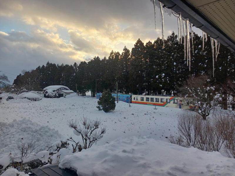2月11日午後4時半頃、試走運転の車両が羽前成田駅を通過していった。今季最大、最長の寒気によって、フラワー長井線も7日から全面運休が続いていた。故障した除雪車を修理しながら、ようやく荒砥長井間の除雪作業終了にこぎつけたのでしよう。12日からは荒砥長井間で、上下各3本の列車が運行され、同時にバスによる代行運送も行われるといいます。 2018年にも10日ほどの運休が続いたが、その時も除雪車が故障した。最近のJRは、頻繁に「計画運休」を発表するようだが、山形鉄道は必死になって運行確保に頑張っているように思う。けれども頼みの綱の除雪車がダウンしては如何ともし難い。安定した運行のためにも、設備の更新が必要不可欠になっているのだろう。 写真では広場一面に杉の枝が散乱し、風雪が激しかったことを伝えている。夕暮れが迫る中、試走する車両の背中には、夜を徹して作業にあたった山鉄社員の姿が見えるようだ。社員の皆さんは疲労困憊の状況だと思われるが、まだ赤湯駅までの除雪作業が残っている。頑張れ、山鉄! 頑張れ、老除雪車!