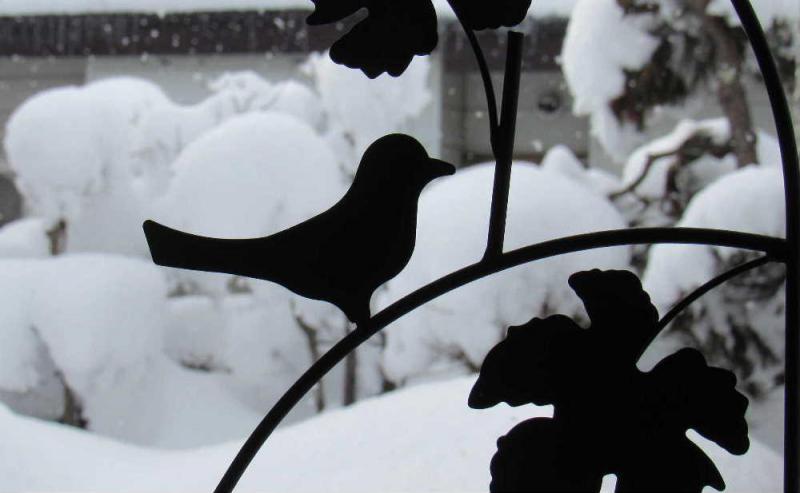 ●ようやく陽が射して青空も見えてきました チラチラと雪は降っていますが明日からは春に向けた天気となりそうです 庭の雪はまさに雪国のように木々を覆っています 東京の孫だったら大喜びでしょうが雪国の私たちはもう雪はたくさんとうんざりしています