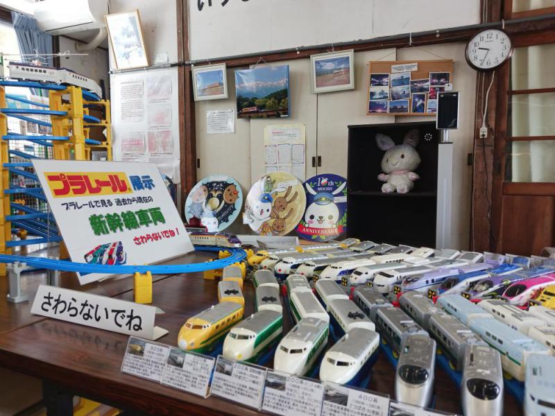 宮内駅には面白いものがたくさんある。「黒板アート」や「新幹線の乗り物」は以前紹介しましたが、駅長室にはもっとすごいものがありました。 駅長室に入るとまず目に飛び込んで来たのが、歴代の新幹線が勢揃いしたプラレール。しかもちゃんと銘板が付けられていた。その奥には、モッチーがデザインされた記念列車のヘッドマーク。さらに驚いたのは、グッズを購入すると山形鉄道オリジナルのペーパークラフトや鉄道カードがもらえるという豪華なおまけ付きだった。 雪が融ければモッチーのお墓にお参りして、駅長室でモッチーのグッズに囲まれながら、思い出を辿るのも素敵な時間かと思います。なお駅長室は月曜日、水曜日は定休。オープンは午前9時半からになってますのでご注意下さい。【おらだの会】駅員さんにお聞きしたら、黒板アートを描いてくれた方も、新幹線の模型を提供してくれた方も山形県置賜支庁の職員さんだそうです。すごいですね。 宮内駅の黒板アートはこちらから → 宮内駅の黒板アート:おらだの会
