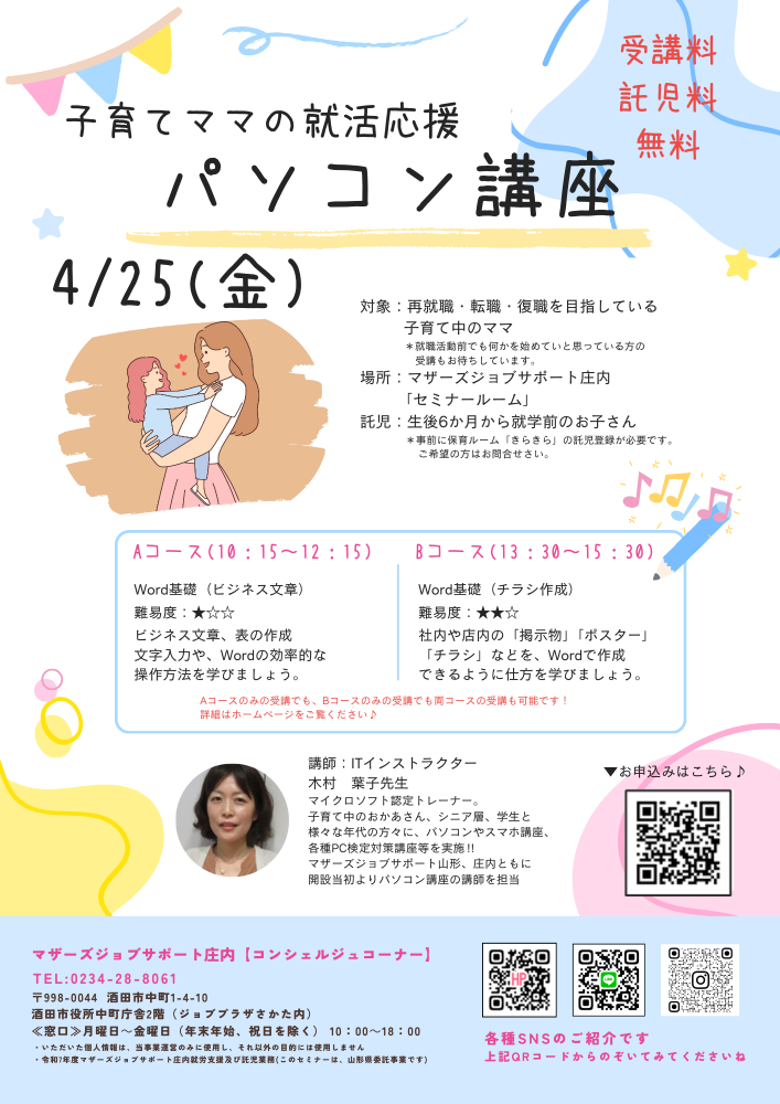 ☆マザーズジョブサポート庄内主催☆毎回大好評!『パソコン講座』のお知らせ ≪Aコース≫ 4月25日(金)10:15〜12:15『Word基礎(ビジネス文章)』ビジネス文章、表の作成文字入力や、Wordの効率的な操作方法を学びましょう。押さえておけば、ビジネスで役立ちます。 ≪Bコース≫ 4月25日(金)13:30〜15:30『Word基礎(チラシ作成)』社内や店内の「掲示物」「ポスター」「チラシ」などを、Wordで作成できるよう学びましょう。 ♪片方のコースのみ、両方のコース、どちらの受講でも可能です♪【対 象】再就職・転職・復職を目指している子育て中のママ※就職活動前で何かを始めたいママもOK【会 場】マザーズジョブサポート庄内 セミナールーム【料 金】受講料 及び 託児料 無料【託 児】※事前登録・予約が必要です。 保育ルーム開室日【水・木・金】の 10:00〜16:00に登録にお越し下さい。 ※併設の保育ルームで、保育スタッフが お子さんをお預かりします。 ママは安心して受講いただけます。 【駐車場について】お車でお越しの際は、中町庁舎脇にあるセントラルホテル契約駐車場をご利用ください。(ジョブプラザさかたと表示してあります。)※契約駐車場が満車の場合は、酒田市中央地下駐車場をご利用ください。無料駐車券(最大2時間)を発行いたします。お帰りの際に、コンシェルジュ窓口へお声がけください。どうぞ、お気軽にお問い合わせくださいね。◇お申込み・お問い合わせ◇マザーズジョブサポート庄内TEL:0234-28-8061メールでのお申込みはコチラ