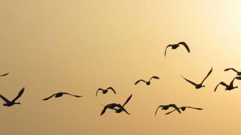 ●夕暮れの黄砂の空を飛ぶ白鳥 昨日の黄砂は空を黄色に染め車や屋根にわずかに降りました でも心配していたほどではありあせんでした 夕日もかすんで見えるほどの空に白鳥が隊列を組んでとんでいました まもなっく北に帰る白鳥たちです なんとなっく愛おしくなりました