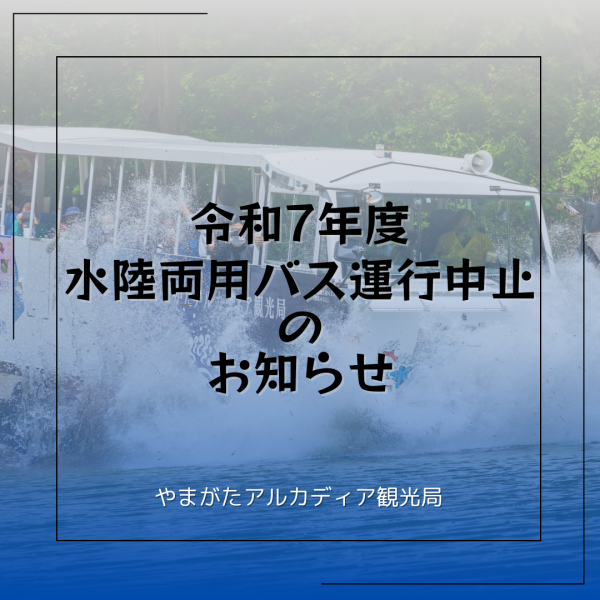 水陸両用バス運行中止のお知らせ長井ダムの災害復旧工事に伴い、今年度の水陸両用バスの運行は中止となりました。 楽しみにお待ちいただいた皆様には大変申し訳ございません。ご理解の程よろしくお願い致します。 やまがたアルカディア観光局 TEL0238-88-1831
