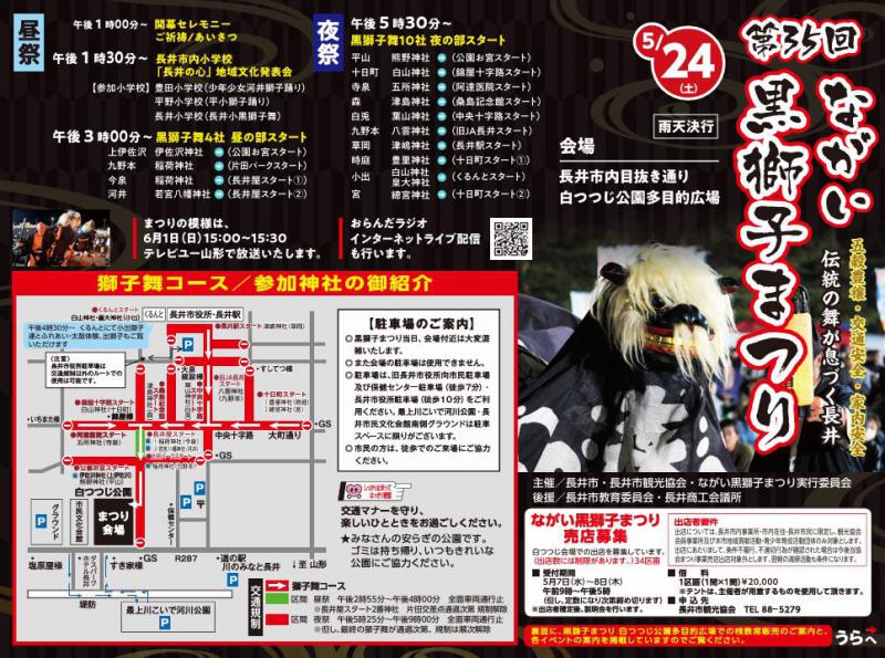 五穀豊穣・交通安全・家内安全 第35回ながい黒獅子まつり日時:5月24日(土) ※雨天決行会場:長井市目抜き通り・白つつじ公園多目的広場 昼祭◯午後1時00分〜 開幕セレモニー ご祈祷/あいさつ ◯午後1時30分〜 長井市内小学校「長井の心」地域文化発表会 参加校 ・豊田小学校(少年少女河井獅子踊り) ・平野小学校(平小獅子踊り) ・長井小学校(長井小黒獅子舞) ○午後3時00分〜 黒獅子舞4社 昼の部スタート ・上伊佐沢 伊佐澤神社 (公園お宮スタート)・九野本 稲荷神社 (片田パークスタート)・今泉 稲荷神社 (長井屋スタート@)・河井 若宮八幡神社 (長井屋スタートA) 夜祭○午後5時30分〜 黒獅子舞10社 夜の部スタート ・平山 熊野神社 (公園お宮スタート)・十日町 白山神社 (錦屋十字路スタート)・寺泉 五所神社 (阿達医院スタート)・森 津島神社 (桑島記念館スタート)・白兎 葉山神社 (中央十字路スタート)・九野本 八雲神社 (JA長井スタート)・草岡 津嶋神社 (長井駅スタート)・時庭 豊里神社 (十日町スタート@)・小出 白山神社・皇大神社 (くるんとスタート)・宮 總宮神社 (十日町スタートA)※最終神社 午後9:30終了予定 -----------------------------------------------------◎まつりの模様は、6月1日(日) 15:00〜15:30テレビユー山形で放送いたします◎おらんだラジオ インターネットライブ配信 も行います。 -----------------------------------------------------◯桟敷席販売のお知らせ前売り販売 <入場受付は午後5時00分>A席(86升)…5,000円(直敷)B席(48升)…4,000円(約40センチ高)他のお客様のご迷惑のため全席イスの使用は禁止します。ご理解とご協力をお願いいたします。(直敷)への着座が困難な方は高さのある『B席』をご購入くださいオプション! プラス2,000円で「弁当」+「地酒」がつきます。ぜひ、ご予約ください! 桟敷席のお求め方法・受付開始/5月12日(月) 午前10時〜・会場/長井市観光協会(道の駅 川のみなと長井にて)・電話受付/5月12日(月)午前10時30分〜 TEL0238−88−5279 ※定員になり次第終了 ≪注意事項≫・桟敷席ご購入以外の方のご利用は、他のお客様にご迷惑がかかりますので、ご遠慮ください。 (※桟敷席券のない方のご着席は固くお断りしています)・桟敷席全席イスの使用は禁止いたします。(直敷)への着座が困難な方は(約40センチ高の)『B席』をご購入ください・不適切行為があった場合は、退席をいただく場合がございます。・タイアップ旅行企画ツアー実施により、一部予約席として確保いたしますので、ご了承ください。・自由席はございませんので、あらかじめご了承ください。・空席があれば、当日販売も行います。 ※桟敷席のお知らせについては後日別途お知らせいたします-------------------------------------------------------◆会場内・周辺上空での小型無人機「ドローン」の飛行については、来場者の安全保護のため禁止しておりますので、ご理解・ご協力をお願いいたします。 開催内容が変更になる場合がございますので、長井市観光ポータルサイト(ホームページ)またSNSにてご確認ください お問い合わせ先 長井市観光協会 0238−88−5279 長井市観光文化交流課 0238—82—8017 ☆.。.:*・°☆.。.:*・°☆.。.:*・°☆☆.。.:*・°☆.。.:*・°☆.。.:*・°☆【長井市観光協会 公式SNS】長井市観光協会のFacebook・Instagramでは、黒獅子の情報をはじめ、開花状況やイベント情報を発信中!ぜひフォローお願いしますFacebookInstagram☆.。.:*・°☆.。.:*・°☆.。.:*・°☆☆.。.:*・°☆.。.:*・°☆.。.:*・°☆