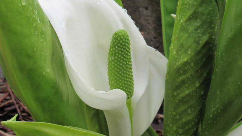 ●雨に濡れた「ミズバショウ」 真っ白な花びらのようなものに包まれた緑色の棒状のものが見えます 白い花弁のようなものは苞(ほう)といって花を保護するために葉が変化したもので花ではないのです 緑色の棒状のものが花がたくさん集まってできた花序(かじょ)というものだそうです ちいさなブツブツの一つ一つが小花と呼ばれる花で 春から初夏を彩る美しい花ですがとても不思議な不思議な植物です