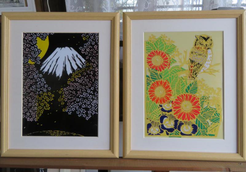 4月11日から開催している「切り絵展」は、おいでになった皆さんから称賛の声をいただいています。多くの作品の中から2つ紹介します。 左は「富士に夜桜」という日本人の心象風景を表現したような作品。とても小さな桜の花びらが印象的で、切込み作業に向かう桑原さんの表情が見えてくるようです。右は植物とフクロウ。黄金色のベースに浮かび上がるフクロウの姿に、宗教画にも似た重厚さを感じます。 ひなびた駅舎に不思議な程にマッチして見える切り絵展。会期は27日(日)までとなっております。ぜひご覧になってください。 【おらだの会】20日(日)にはお花見会を予定しておりますが、当日の天候によっては駅舎内で行うことも考えられます。その際は、駅茶への入場が制限されることも予想されます。ご事情ご賢察のうえ、ご理解賜りますようお願いいたします。