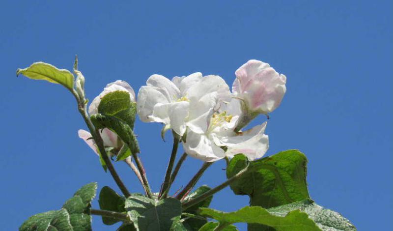 ●白いリンゴの花が満開 桜が終わりリンゴの真っ白な花が一面に咲くリンゴ畑で写真を撮りました 桜よりは少し大きく色もつぼみはピンクですが開花すると真っ白になり趣の違った花です 近くにラフランスの木もありましたがラフランスの花はすっかり終わっていました 何という種類のリンゴでしょうか