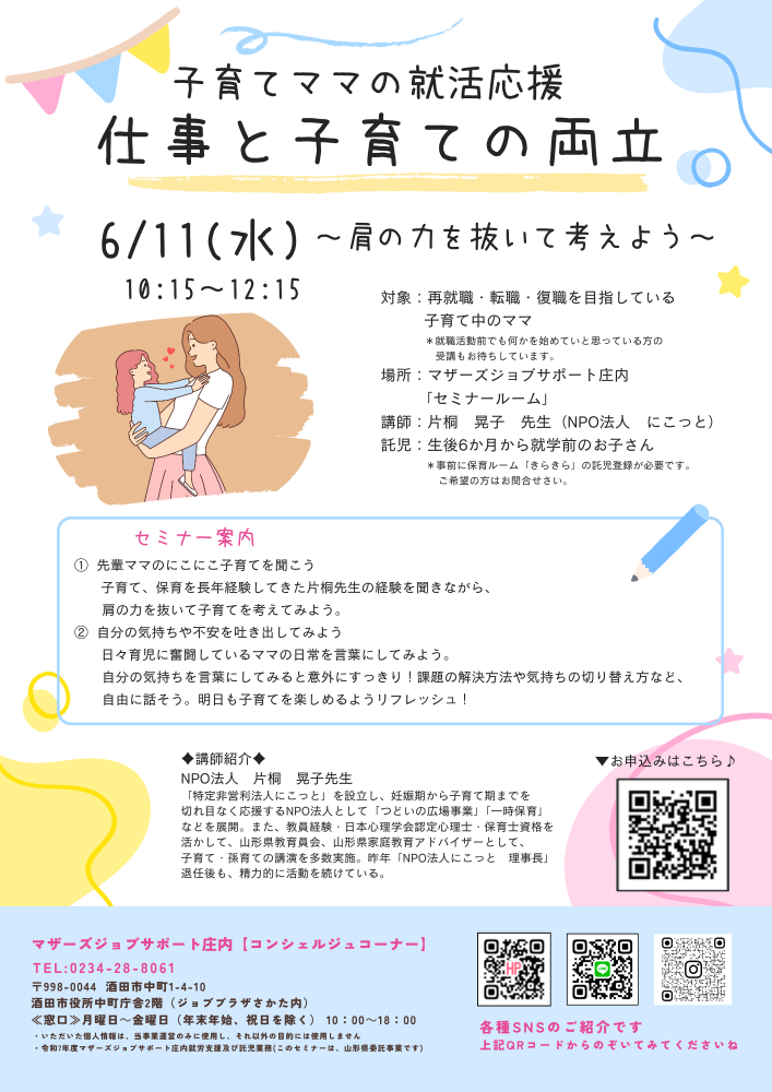 ☆マザーズジョブサポート庄内主催☆〜子育てママの就活応援〜「仕事と子育ての両立」のお知らせです。 子育て、保育に長年携わってきた片桐先生の経験を聞きながらご自身の子育てについて考えてみましょう(^^♪課題の解決方法や気持ちの切り替え方などを自由に話して不安な気持ちをぜひ吐き出してください☆肩の力を抜いて明日も子育てを楽しめるようリフレッシュ(^_-)-☆ 【日 時】6月11日(水)10時15分〜12時15分 【対 象】再就職・転職・復職を目指している子育て中のママ※就職活動前で何かを始めたい方でもOK【会 場】マザーズジョブサポート庄内 セミナールーム【料 金】受講料 及び 託児料 無料【託 児】※事前登録・予約が必要です。ご利用希望の方はお問合せください。保育ルーム開室日【水・木・金】の10:00〜16:00に登録が必要となります。 ※併設の保育ルームで、保育スタッフが お子さんをお預かりします。 ママは安心して受講いただけます。 【駐車場について】お車でお越しの際は、中町庁舎脇にある〈セントラルホテル契約駐車場〉をご利用ください。(ジョブプラザさかたと表示してあります。)※契約駐車場が満車の場合は、酒田市中央地下駐車場をご利用ください。無料駐車券(最大2時間)を発行いたします。 どうぞ、お気軽にお問い合わせくださいね。☆★☆コンシェルジュコーナーでLINEアカウントやっております♪ ☆★☆セミナーのお知らせや、お問い合わせ、お申込みにも対応しています♪ぜひお友達になってください☆https://lin.ee/zBnhdYULINEの場合は「お名前、電話番号、申込み講座、託児の有無」を送信して返信をお待ちください ◇お申込み・お問い合わせ◇マザーズジョブサポート庄内TEL:0234-28-8061メールでのお申込みはコチラマザーズジョブサポート庄内コンシェルジュコーナーからの返信をもって申込受付完了となります