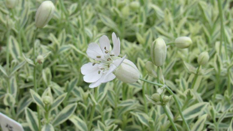 ●葉っぱも花も可愛い「シレネ・ユニフローラ」 知人からいただいた「シレネ・ユニフリーラ」の可愛い花が咲きました 別名「袋撫子」と呼ばれているように花の下が袋のように膨らんでその先に花を付けています 葉っぱも白い縁取りがされていて可愛い植物です 宿根草とのことですから来年も咲かせてくれるように育てようと思います