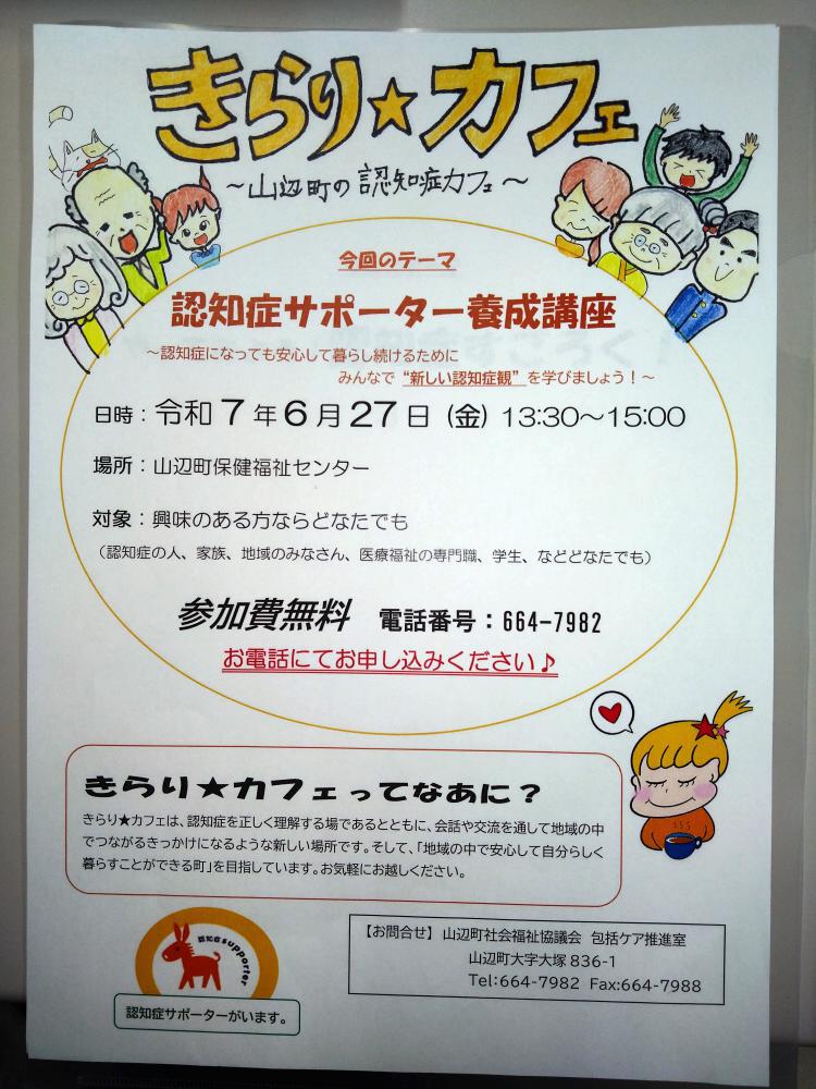 認知症の方、介護や認知症に関心のある方ならどなたでも参加でき、みんなが気軽に立ち寄れる「つながり」と「きっかけ」ができる新しい場所です。・日時/令和7年6月27日(金)午後1時30分〜3時00分・内容/「認知症サポーター養成講座」認知症になっても安心して暮らし続けるためにみんなで”新しい認知症観”を学びましょう!・場所/山辺町保健福祉センター・対象者/関心のある方ならどなたでも・参加費/無料【事前に申し込みが必要です】申込問合せ 山辺町社会福祉協議会 電話(664)7982
