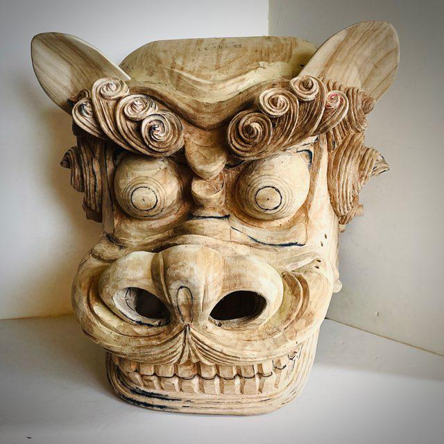 先日、店の居間に獅子頭木地が多数展示しているが、森助モデルの獅子と目が合った。