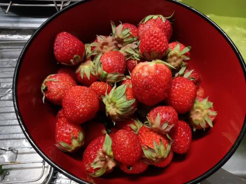 山友からの自家製イチゴ三回目?お裾分けでいただいた。これが最後かな、ペンション友や同じ山友にも配ったようですね、食べきれん時は冷凍かジャムですね・・我が家のルバーブ今年は成長悪いと思っていたら、単にいつもの年より遅かっただけみたいでした、このところの雨でぐいーんと成長したようで・・いつものルバーブとのミックスジャム作りました・・ルバーブは次の休みで春採り終了して、余分は冷凍に、そして夏、秋と3回は収穫できます。ただし春一番のルバーブが酸味強くおいしいようだ・・