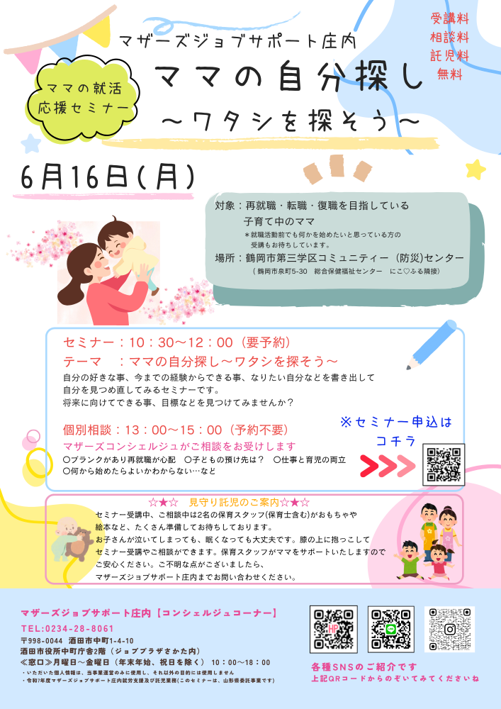 マザーズジョブサポート庄内【ママの自分探し〜ワタシを探そう〜】主張相談会を開催します。【開催日】6月16日(月)【開催場所】鶴岡市第三学区コミュニティセンター (鶴岡市泉町5-30  総合福祉センターにこふる隣接) 【内容】10:30〜12:00(要予約) セミナーテーマ【ママの自分探し〜ワタシを探そう〜】自分の好きな事、今までの経験からできる事、なりたい自分などを書き出して自分を見つめ直してみるセミナーです。将来の目標に向けてできる事、目標などを見つけてみませんか?13:00〜15:00(予約不要) 個別相談・ブランクがあり再就職が心配・子どもの預け先は?・仕事と家事、子育てとの両立      など、お気軽にご相談ください。※どなたでもご利用いただけます。 ♪お子さんと一緒に、お気軽にお越しください♪お子さんと同じお部屋でセミナーを受講し、相談することができます。保育スタッフが、ママをサポートいたします。 どうぞ、お気軽にお問い合わせくださいね。☆★☆コンシェルジュコーナーでLINEアカウントやっております♪              ☆★☆セミナーのお知らせや、お問い合わせ、お申込みにも対応しています♪ぜひお友達になってください☆https://lin.ee/zBnhdYULINEの場合は「お名前、電話番号、申込み講座、託児の有無」を送信して返信をお待ちください
