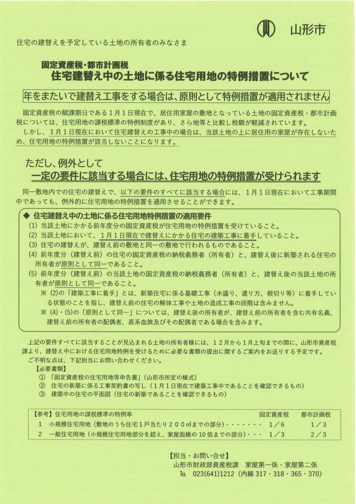 住宅建替え中の土地に係る住宅用地の特例処置についてという案内が山形市財政部資産税課より届きました。通常、1月1日現在において居住用家屋の敷地となっている土地の固定資産税・都市計画税には特例制度がありますが、年をまたいで建替え工事をする場合は原則、特例処置が適用されません。しかし、一定の要件に該当する場合には、例外的に住宅用地の特例処置を適用させることができますよ、というご案内です。昨今、建築確認審査の対象となる建築物の規模の見直し及び建築確認・審査に係る審査省略の特例が廃止されたことにより、多岐に渡る書類審査に一定の期間が必要となっております。建替え工事が年末まで終わらないケースもございますので、立替えをお考えの方、または現在建替え工事中の方はご一読ください。詳しくは山形市財政部資産税課 家屋第一係・家屋第二係にお問い合わせください。023-641-1212 (内線317・318・365・370)