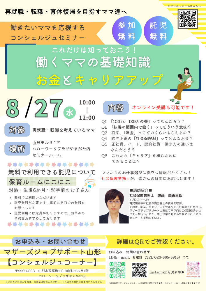 社会保険労務士を講師に招いて行う『これだけは知っておこう! 働くママの基礎知識 お金とキャリアアップ』セミナー8月開催のお知らせです。◇:*:☆:*:◇:*:☆:*:◇:*:☆:*:◇:*:☆:*:◇ 大人気の社労士セミナーです!・103万、130万の壁ってなに?・扶養の範囲内で働くとは どういうこと?・働くママの年金や 社会保険はどうなる?・キャリアを積むために 今できることは? これから、自分の働き方を決めるために知っておきたいお金のことについて、キャリアアップできる働き方について、必要な情報をお伝えします。 オンラインでの受講も可能です!●ご自宅でオンライン受講ご利用の方へ●・インターネット環境が必要になります。 通信料は自己負担です。・パソコン、スマートフォン、 またはタブレットで受講できます。・スマホまたはタブレットをご利用の方は 事前にZoom meetingsを ダウンロードしてください。・セミナー中はカメラをオンにし、 お顔の見える状態で受講して下さい。 また、マイクで会話による現状確認が できる形でご受講をお願いしております。 ☆--- -- -- -- -- -- -- -- -- -- --☆【日時】8月27日(水)10:00〜12:00【講師】社会保険労務士 佐藤 由香里氏 (佐藤社会保険労務士事務所) 【会場】ハローワークプラザやまがた内セミナールーム または ご自宅でオンライン受講 (zoom使用)【託児】セミナールームで受講の方のみ利用できます。定員がありますので、お早めにご予約ください。【受講料・託児料】 無料 ☆ご自宅にてオンライン受講の方は、 zoom通信料等はご自身負担になります。☆--- -- -- -- -- -- -- -- -- -- --☆ □お問い合わせ□マザーズジョブサポート山形【コンシェルジュコーナー】◇電話でのお申込み→023-665-5915◇お申込みメール→コチラ◇LINEでのお申込みトーク画面にて・お名前・お申込み講座・託児の有無・お電話番号を送信してください。※返信をもって申込完了となります。 ↓公式LINE追加はこちら↓☆メール・LINE・電話での対応は 開庁日のみとなります。 メール、LINEは開庁時間内で 返信いたします。
