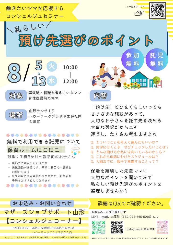 コンシェルジュセミナー「私らしい預け先選びのポイント」を開催します! ◇:*:☆:*:◇:*:☆:*:◇:*:☆:*:◇:*:☆:*:◇ お子さんの「預け先」と言ってもさまざまな保育施設があります。各施設の特色や、見学の時のチェックポイント、申込み先や申込み方法、入園までに準備すること、などなど具体的な内容を一緒に学び、あなたらしい預け先選びを模索してみましょう! 7月開催のセミナー『ゼロから学ぼう!お子さんの預け先』から続けての受講も大歓迎です! 【日時】 8月5日(火)または13日(水) 10:00〜12:00【会場】 ハローワークプラザやまがた内 会議室【託児】 あり お早めにご予約ください【受講料・託児料】 無料 □お問い合わせ□マザーズジョブサポート山形【コンシェルジュコーナー】◇電話でのお申込み→023-665-5915◇お申込みメール→コチラ◇LINEでのお申込み→トーク画面にて・お名前・お申込み講座・託児の有無・お電話番号を送信してください。※返信をもって申込完了となります。↓公式LINE追加はこちら↓☆メール・LINE・電話での対応は 開庁日のみとなります。 メール、LINEは開庁時間内で 返信いたします。