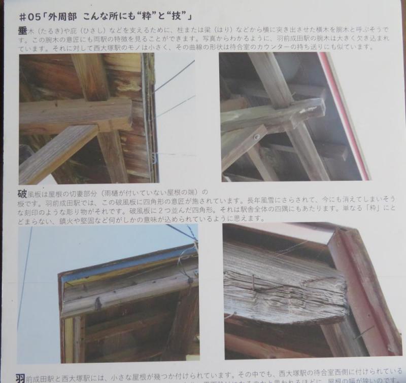 西大塚駅と羽前成田駅。車寄せに続いての見所は、腕木と破風板です。屋根の方を見てみてください。ここにも面白い見所が隠れています。まずは腕木です。腕木は、垂木 (たるき)や庇 (ひさし) などを支えるために、柱または梁 (はり) などから横に突き出させた横木のことです。この腕木の意匠にも両駅の特徴を見ることができます。羽前成田駅の腕木が大きく欠き込まれているのに対して西大塚駅の欠き込みは小さく、その曲線の形状は待合室のカウンターの持ち送りにも似ています。  → 腕木の欠き込み:おらだの会  また破風板(はふいた)の仕上がりにも違いが見られます。破風板は屋根の切妻部分(雨樋が付いていない屋根の端)の板です。羽前成田駅では、この破風板に四角形の意匠が施されています。長年風雪にさらされて、今にも消えてしまいそうな刻印のような彫り物がそれです。破風板に2つ並んだ四角形。それは駅舎全体の四隅にもあたります。単なる「粋」にとどまらない、鎮火や堅固など何がしかの意味が込められているように思えます。  → 破風板の刻印:おらだの会