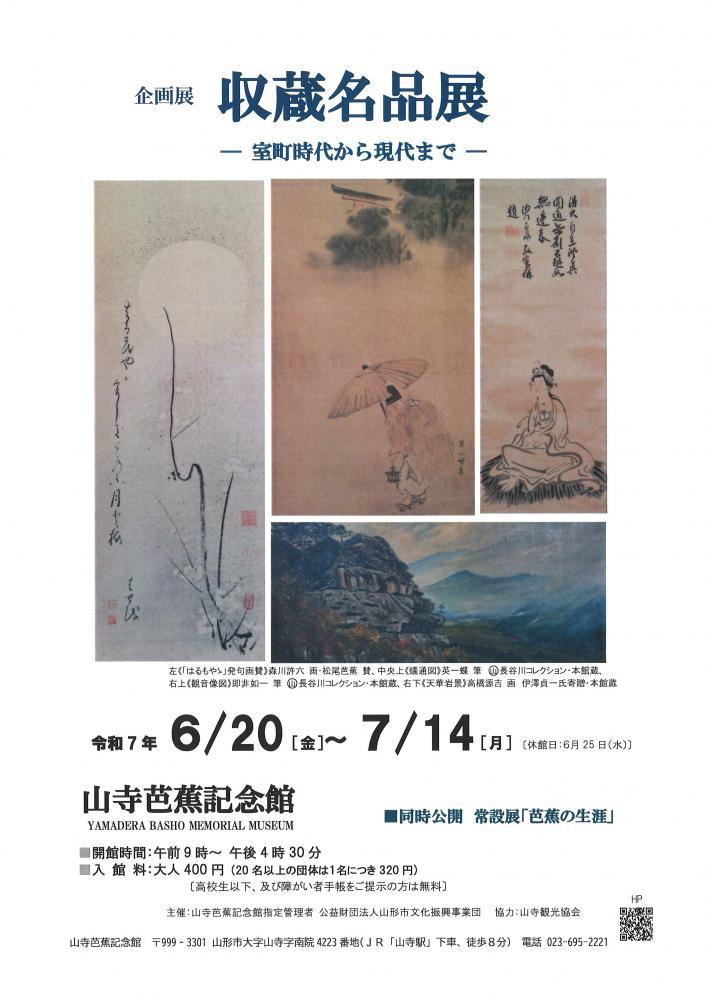 企画展「収蔵名品展 −室町時代から現代まで−」会期:令和7年6月20日(金)〜7月14日(月) (休館日:6月25日) 山寺芭蕉記念館の収蔵品より「はるもやゝ」(森川許六 画・松尾芭蕉 賛)、「蟻通図」(英一蝶 筆)をはじめとする名品を選び公開します。 芭蕉の書や山(山に丸)長谷川コレクション、穎原退蔵・尾原仂コレクションなどから俳文学や歴史資料の名品を、また注目すべき絵画作品を選りすぐって展示します。文学的、美術的価値の高い作品を是非ご覧ください。