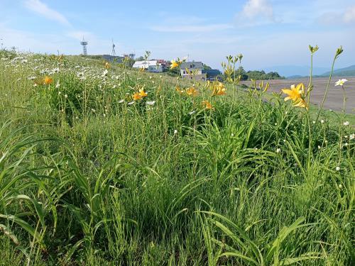 天元台高原の高原駅降りてリフトセンターに行く斜面に初めに咲くコバイケソウのあとにニッコウキスゲが咲く・・ぽつぽつと見えていたニッコウキスゲも少し固まって咲いてるのが見え始めました・・このあと麓では終わってしまったヒメサユリも高原ではこれからです・