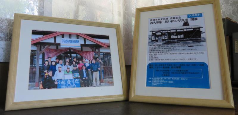 2015年(平成27年)8月、西大塚駅と羽前成田駅は文化庁の登録有形文化財に認定された。木造駅舎『絆』展に展示されている上の写真は、西大塚駅と羽前成田駅での関連事業の記録である。 西大塚駅では、9月19日9時半から認定プレートのお披露目会があり、その後22日まで米屋こうじさんを代表とする「西大塚駅を応援する会」の主催による写真展が開催された。米屋さんのブログにその時の思いが綴られているので紹介します。 ////はじめ、山形鉄道の担当者さまからお声がけいただいた時には、単に「米屋の写真を展示して欲しい」旨のお話でした…。しかし、今回はめでたく文化財登録となった訳ですので、長く駅を利用されてきた、地域のみなさまにも参加していただき、一緒に祝うことができればなぁ、と思いました。/// → 鉄道憧憬 西大塚駅「登録有形文化財」プレートのお披露目会 → 鉄道憧憬 西大塚駅「登録有形文化財」 登録を祝うイベントを開催します! 一方、成田駅は10月25日の長井線祭りに合わせてお披露目された。立派な認定プレートも嬉しいけれど、こんなメッセージが寄せられたのはもっと嬉しかった。///生まれ育ったこの町、この駅。懐かしく、心温まります。永久にあればと願います。来るたびに必ず見に来ます。こんなふるさと成田駅。私は誇りです。心から応援しています。/// → (46)成田駅が登録有形文化財に(平成27年):おらだの会 祝賀会には広田泉さんや123(いずみ)の会の皆さんの顔がありました。久しぶりの再会でした。祝賀会が終わった後、当時の宮崎会長と広田泉さんが固い握手をしている姿がありました。広田さんは翌年の春から「ちゃぶ台写真展」や「3駅交流写真展」など、山形鉄道を応援する企画を矢継ぎ早に実施してくれました。お披露目会の時、二人の間に何かの思いが伝わったように思えてならない。広田さんの再降臨を見届けるかのように翌28年9月、宮負長は旅立たれたのでした。 → 広田泉伝[4] 長井線祭りに再降臨2015年:おらだの会
