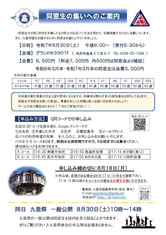 【日 時】 令和7年8月30日(土)                   午後6:00から (受付5:30から)【会 場】 グランドホクヨウ 1F (米沢市金池 2 丁目 3 -7 TEL: 0238-22-1238)【会 費】 6,500円(令和6年・令和7年3月卒の同窓生は3,000円)申し込みはこちら↓https://docs.google.com/forms/d/e/1FAIpQLSeIN_ZL3PTHOv8vxzzNowANiX2s_AbmDZHae-i7AMts4iZoUw/viewform