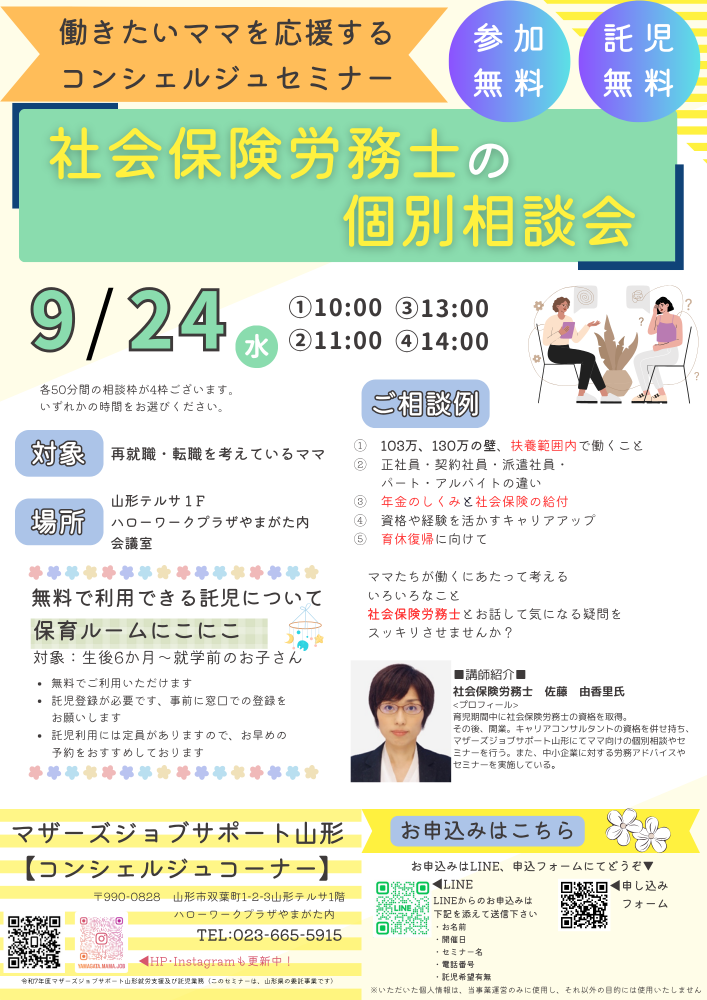 マザーズジョブサポート山形【コンシェルジュコーナー】では社会保険労務士による個別相談会を開催しております。◇:*:☆:*:◇:*:☆:*:◇:*:☆:*:◇:*:☆:*:◇@ 103万、130万の壁ってなに?A 扶養の範囲ってどういうこと?B 年金と保険料の仕組みって?C 正社員とパート、どう違うの?D 資格を活かしたキャリアアップって? こんな疑問を解決しませんか?ご相談は、お一人50分間。ご相談料は無料です。ご相談中の託児もご利用いただけます。これから働き始めるうえで知っておきたい基礎知識、損にならない働き方、相談してみませんか?現在、ご自身も子育て中の社会保険労務士 佐藤由香里先生がやさしいママ目線で、ご相談をお受けします!お気軽にお問合せくださいね。  □お問い合わせ□マザーズジョブサポート山形【コンシェルジュコーナー】◇電話でのお申込み→023-665-5915◇お申込みメール→コチラ◇LINEでのお申込み→トーク画面にて・お名前・お申込み講座・託児の有無・お電話番号を送信してください。返信をもって申込完了となります。↓公式LINE追加はこちら↓☆メール・LINE・電話での対応は 開庁日のみとなります。 メール、LINEは開庁時間内で 返信いたします。